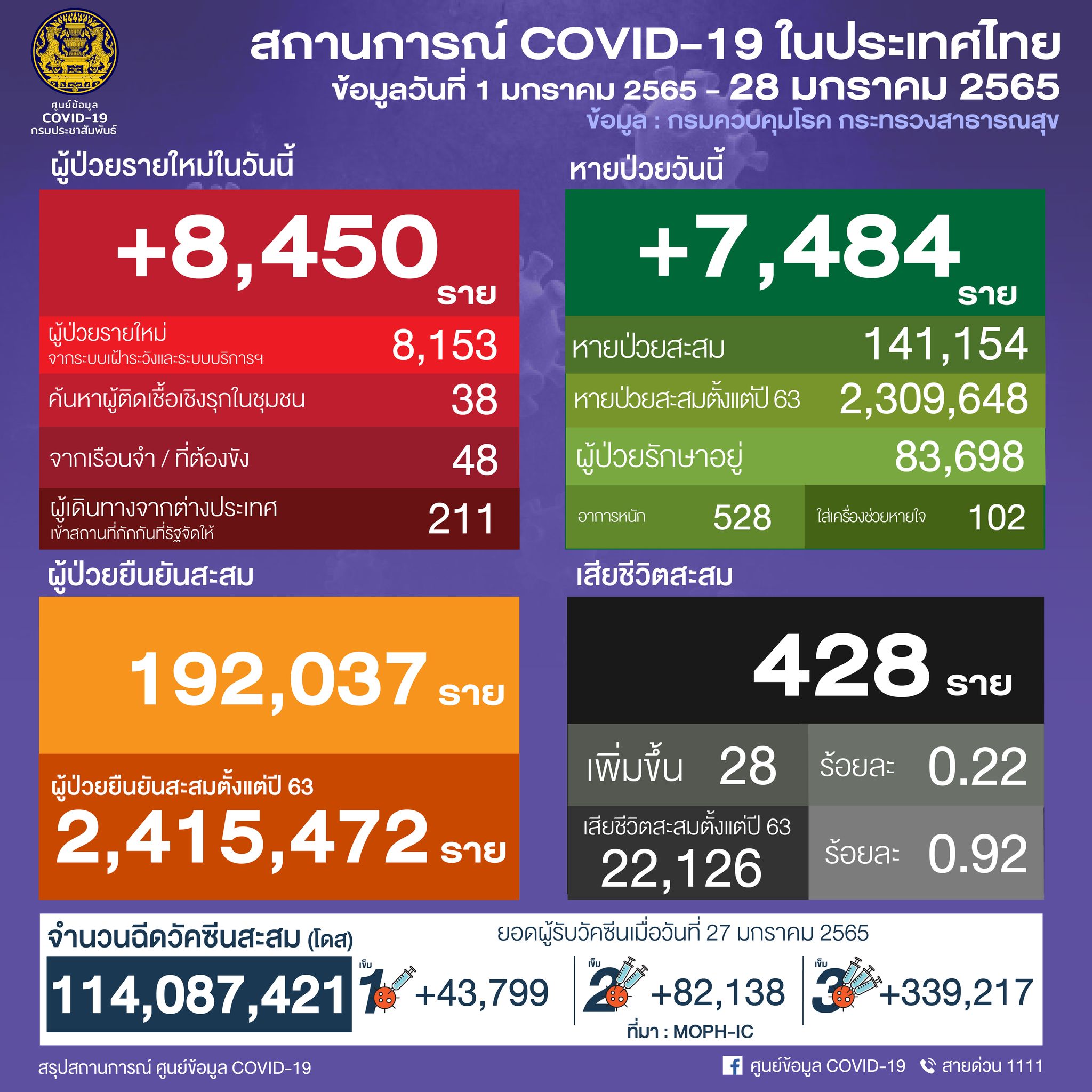 ยอดผู้ติดเชื้อโควิด-19 วันศุกร์ที่ 28 มกราคม 2565 รวม 8,450 ราย จำแนกเป็น