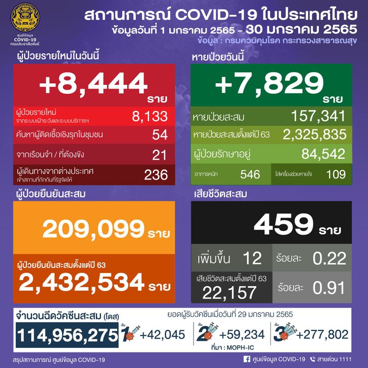 ยอดผู้ติดเชื้อโควิด-19 วันอาทิตย์ที่ 30 มกราคม 2565 รวม 8,444 ราย จำแนกเป็น