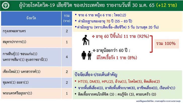 รายละเอียดผู้เสียชีวิตของประเทศไทย วันอาทิตย์ที่ 30 มกราคม 2565 จำนวน 12 ราย