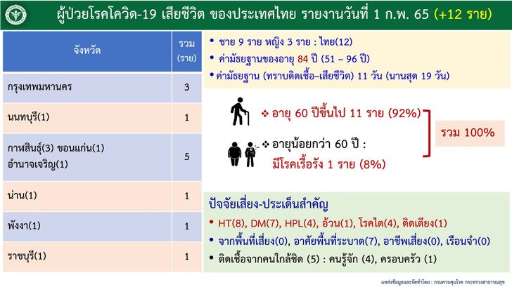 รายละเอียดผู้เสียชีวิตของประเทศไทยวันอังคารที่ 1 กุมภาพันธ์ 2565 จำนวน 12 ราย
