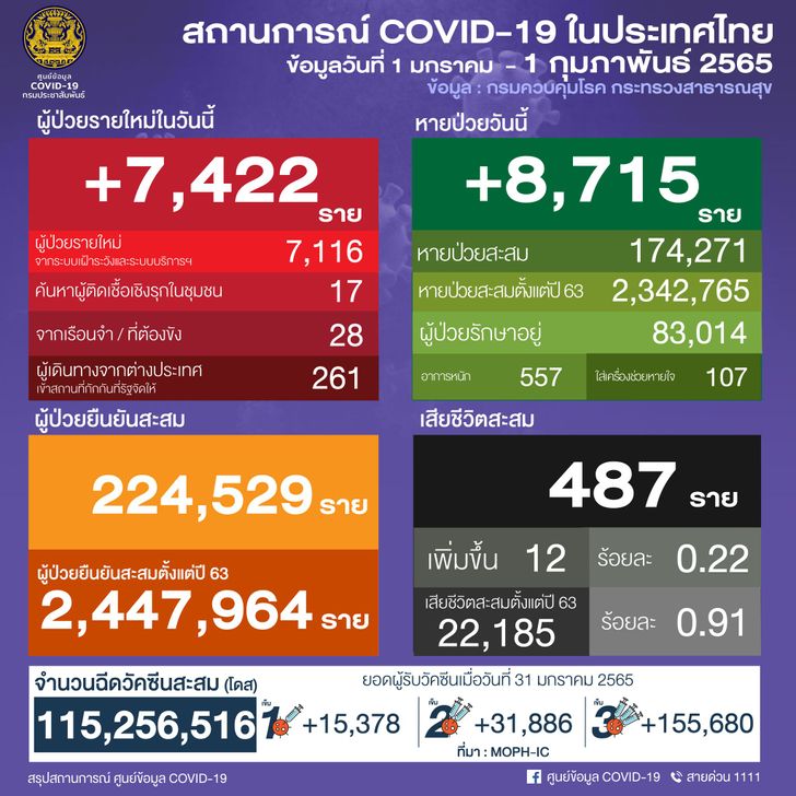ยอดผู้ติดเชื้อโควิด-19 วันอังคารที่ 1 กุมภาพันธ์ 2565 รวม 7,422 ราย จำแนกเป็น