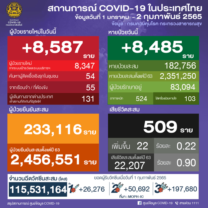 ยอดผู้ติดเชื้อโควิด-19 วันพุธที่ 2 กุมภาพันธ์ 2565 รวม 8,587 ราย จำแนกเป็น