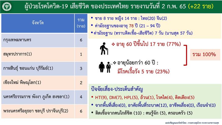 รายละเอียดผู้เสียชีวิตของประเทศไทยวันอังคารที่ 2 กุมภาพันธ์ 2565 จำนวน 22 ราย