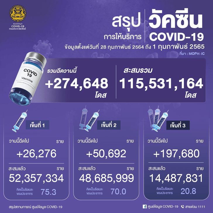 ภาพรวมยอดฉีดวัคซีน วันที่ 1 กุมภาพันธ์ 2565 ยอดฉีดทั่วประเทศ 274,648 โดส