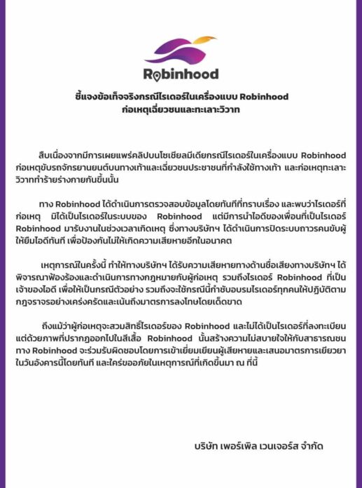 จากกรณีเพจ อยากดังเดี๋ยวจัดให้ รีเทริน์ part 3 โพสต์คลิปเหตุการณ์ "เต่า หน้าลาย" ไรเดอร์กร่าง สวมเครื่องแบบ Robinhood ขี่รถจักรยานยนต์บนฟุตปาธ บริเวณซอยสายไหม 78 เขตสายไหม กทม. ก่อนไปเฉี่ยวชนหนุ่มที่เดินอยู่บนฟุตปาธ แล้วลงมาทำร้ายร่างกายคนที่โดนเฉี่ยวซ้ำ ล่าสุดวานนี้ (7 ก.พ.) ทาง Robinhood ได้ออกแถลงการณ์ถึงกรณีดังกล่าว ระบุว่า