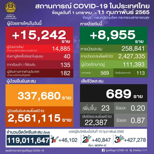 ยอดผู้ติดเชื้อโควิด-19 วันศุกร์ที่ 11 กุมภาพันธ์ 2565 รวม 15,242 ราย จำแนกเป็น