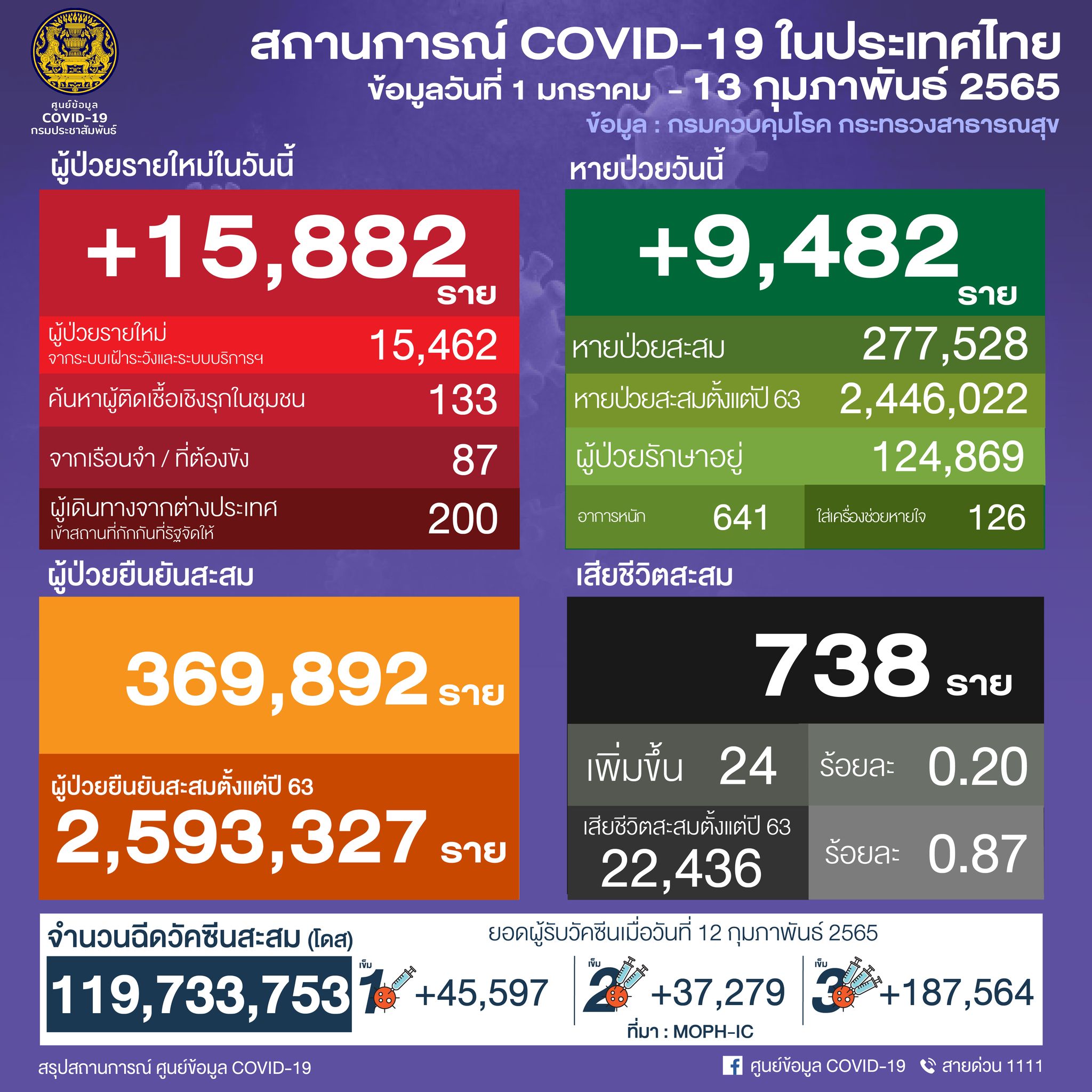 ยอดผู้ติดเชื้อโควิด-19 วันอาทิตย์ที่ 13 กุมภาพันธ์ 2565 รวม 15,882 ราย จำแนกเป็น