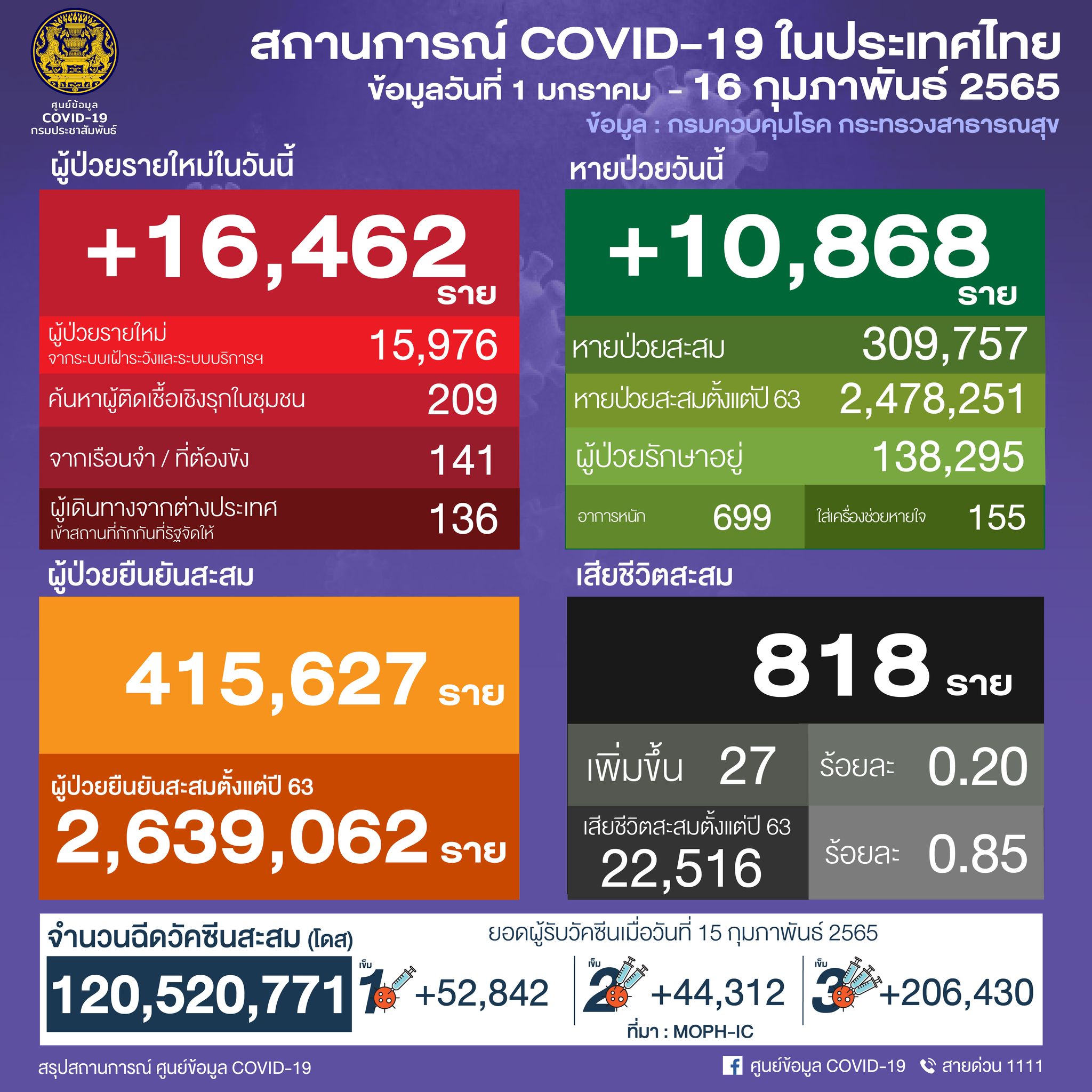 ยอดผู้ติดเชื้อโควิด-19 วันพุธที่ 16 กุมภาพันธ์ 2565 รวม 16,462 ราย จำแนกเป็น