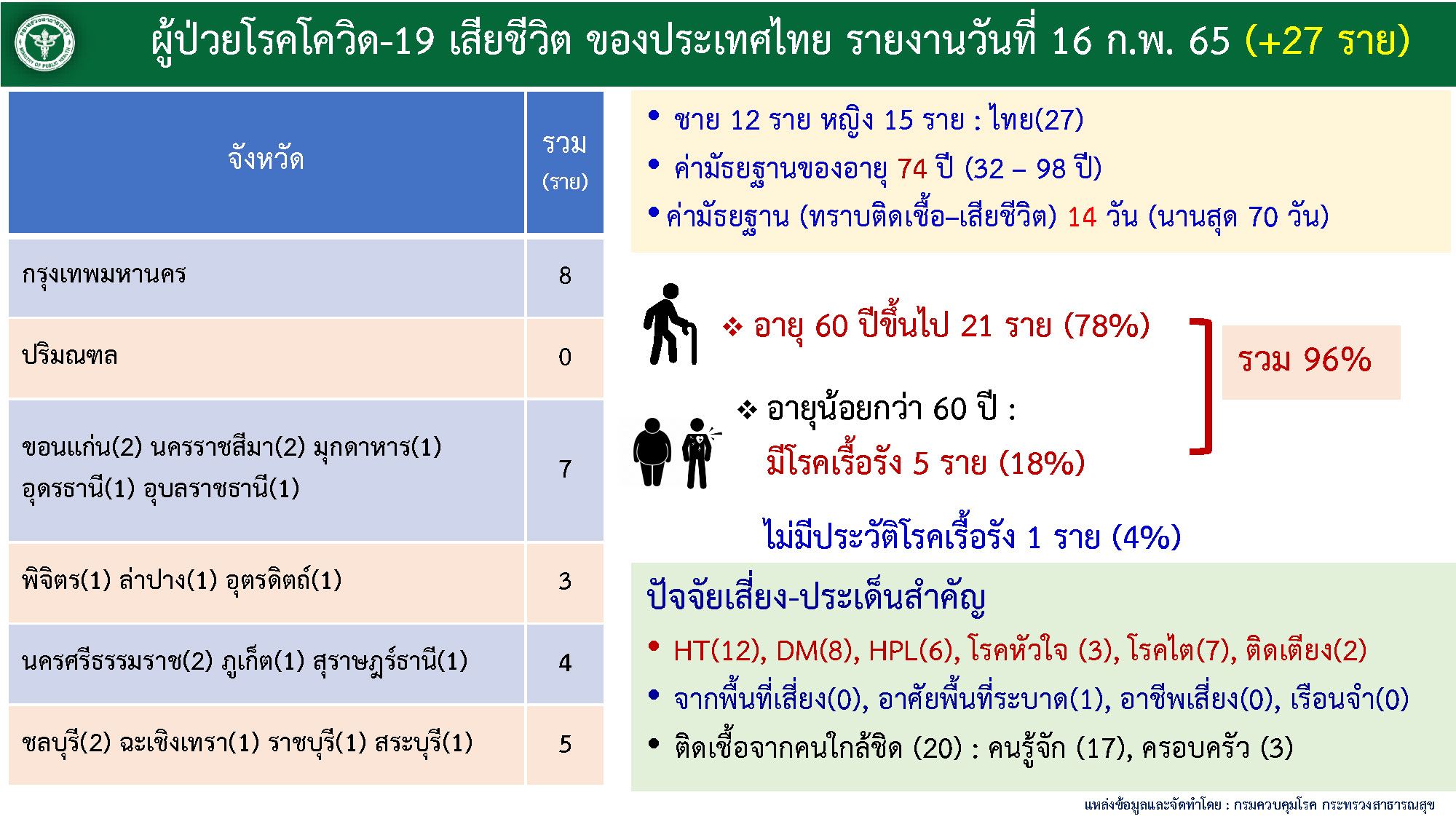 รายละเอียดผู้เสียชีวิตของประเทศไทยวันพุธที่ 16 กุมภาพันธ์ 2565 จำนวน 27 ราย