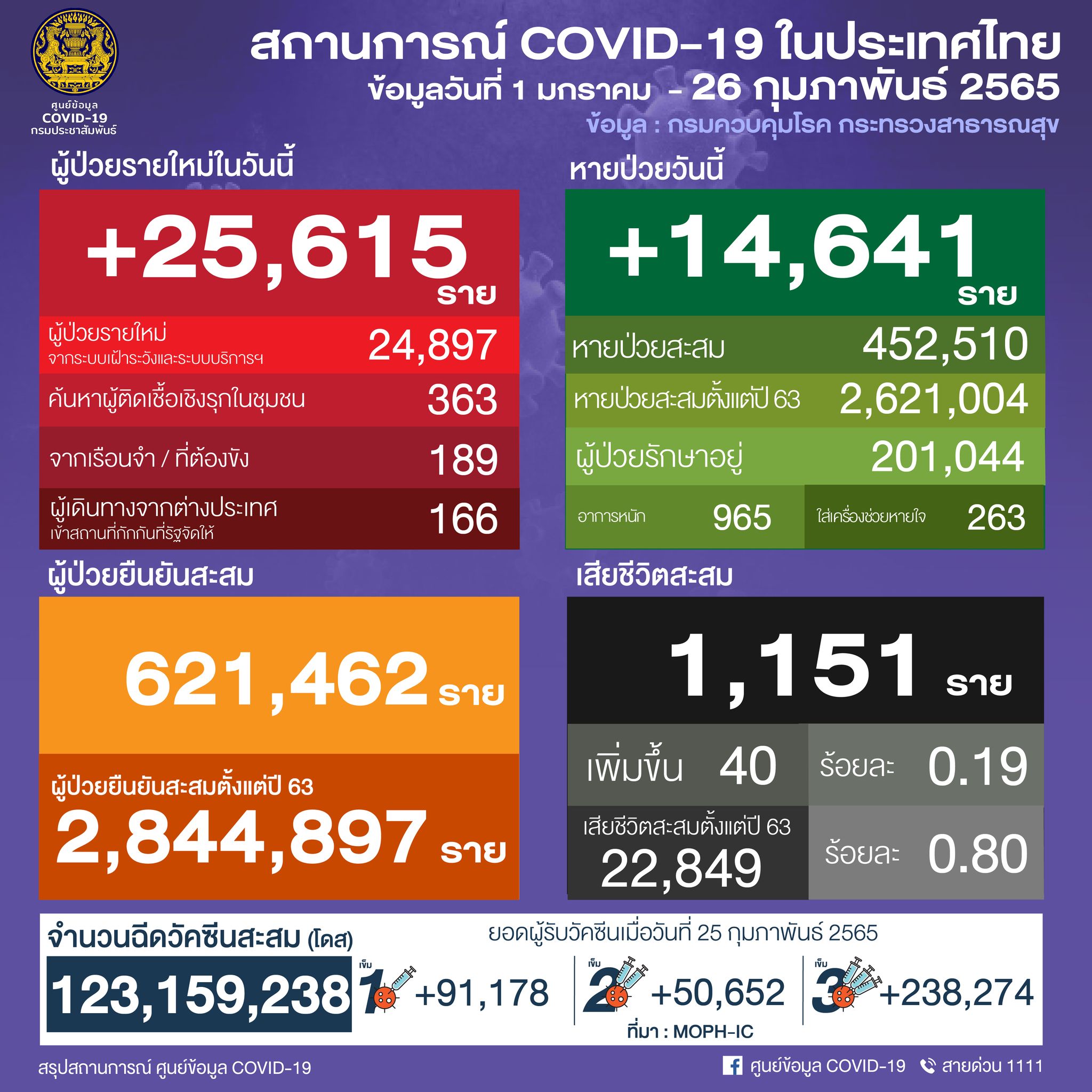 ยอดผู้ติดเชื้อโควิด-19 วันเสาร์ที่ 26 กุมภาพันธ์ 2565 รวม 25,615 ราย จำแนกเป็น