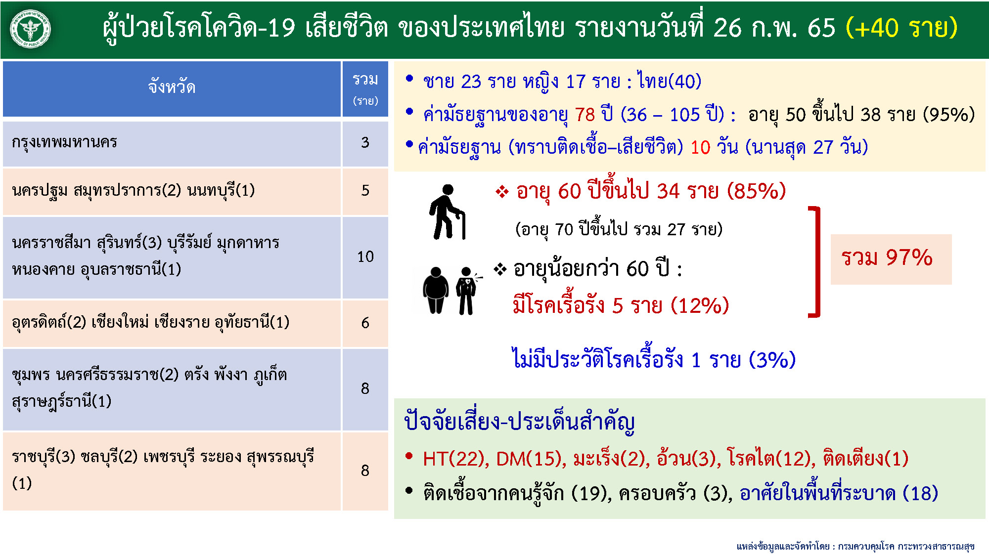 รายละเอียดผู้เสียชีวิตของประเทศไทยวันเสาร์ที่ 26 กุมภาพันธ์ 2565 จำนวน 40 ราย