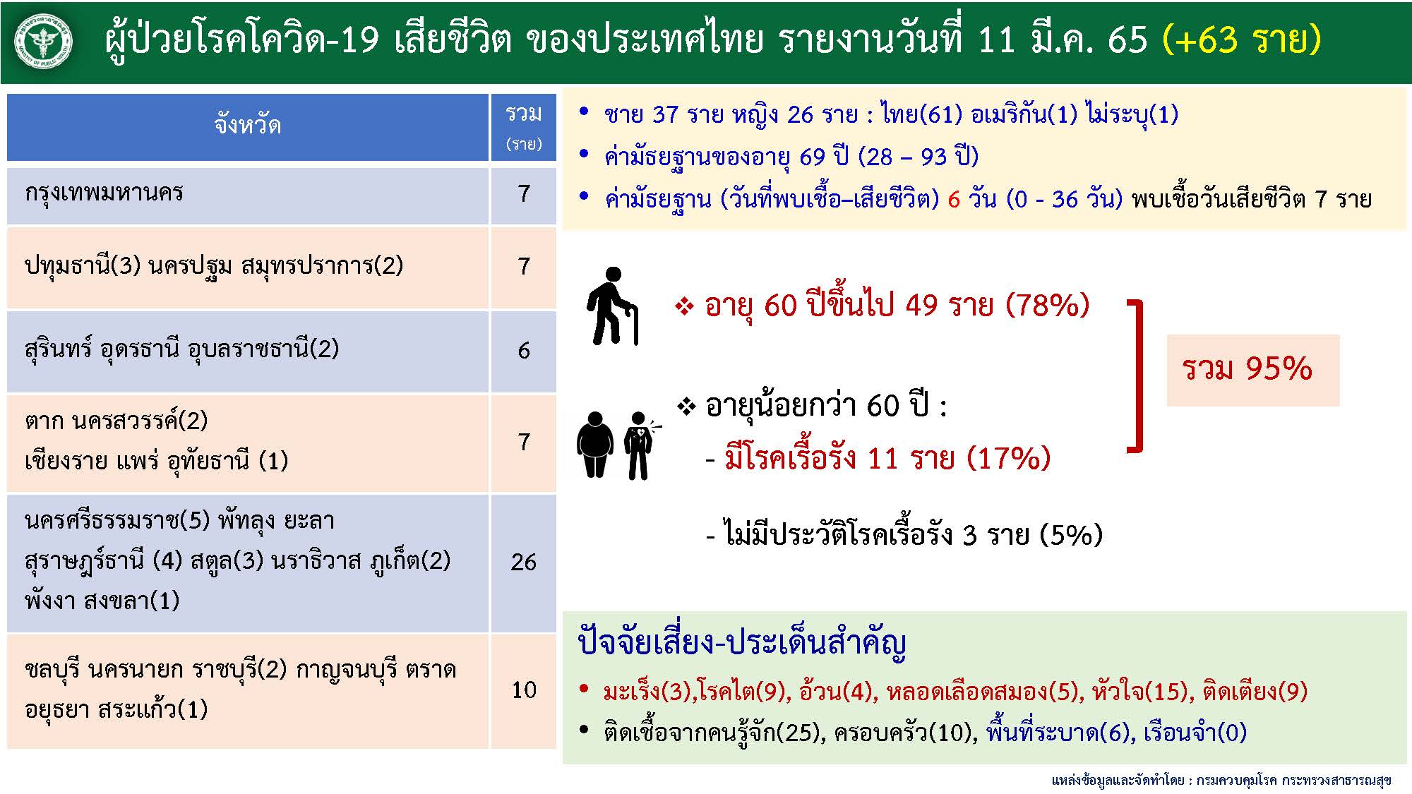 รายละเอียดผู้เสียชีวิตของประเทศไทยวันศุกร์ที่ 11 มีนาคม 2565 จำนวน 63 ราย