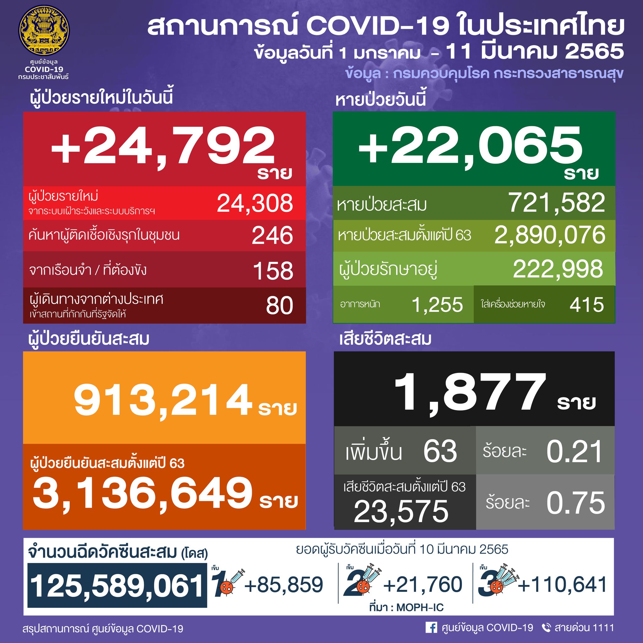 ยอดผู้ติดเชื้อโควิด-19 วันศุกร์ที่ 11 มีนาคม 2565 รวม 24,792 ราย จำแนกเป็น