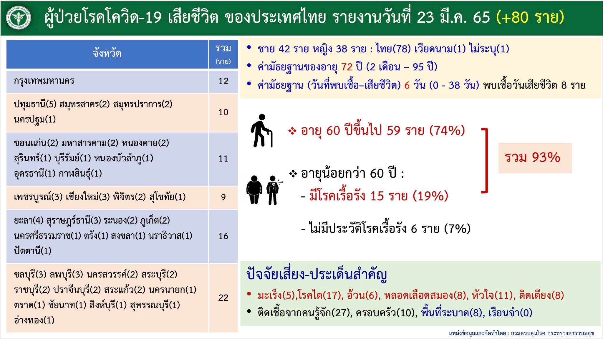 รายละเอียดผู้เสียชีวิตของประเทศไทย วันพุธที่ 23 มีนาคม 2565 จำนวน 83 ราย