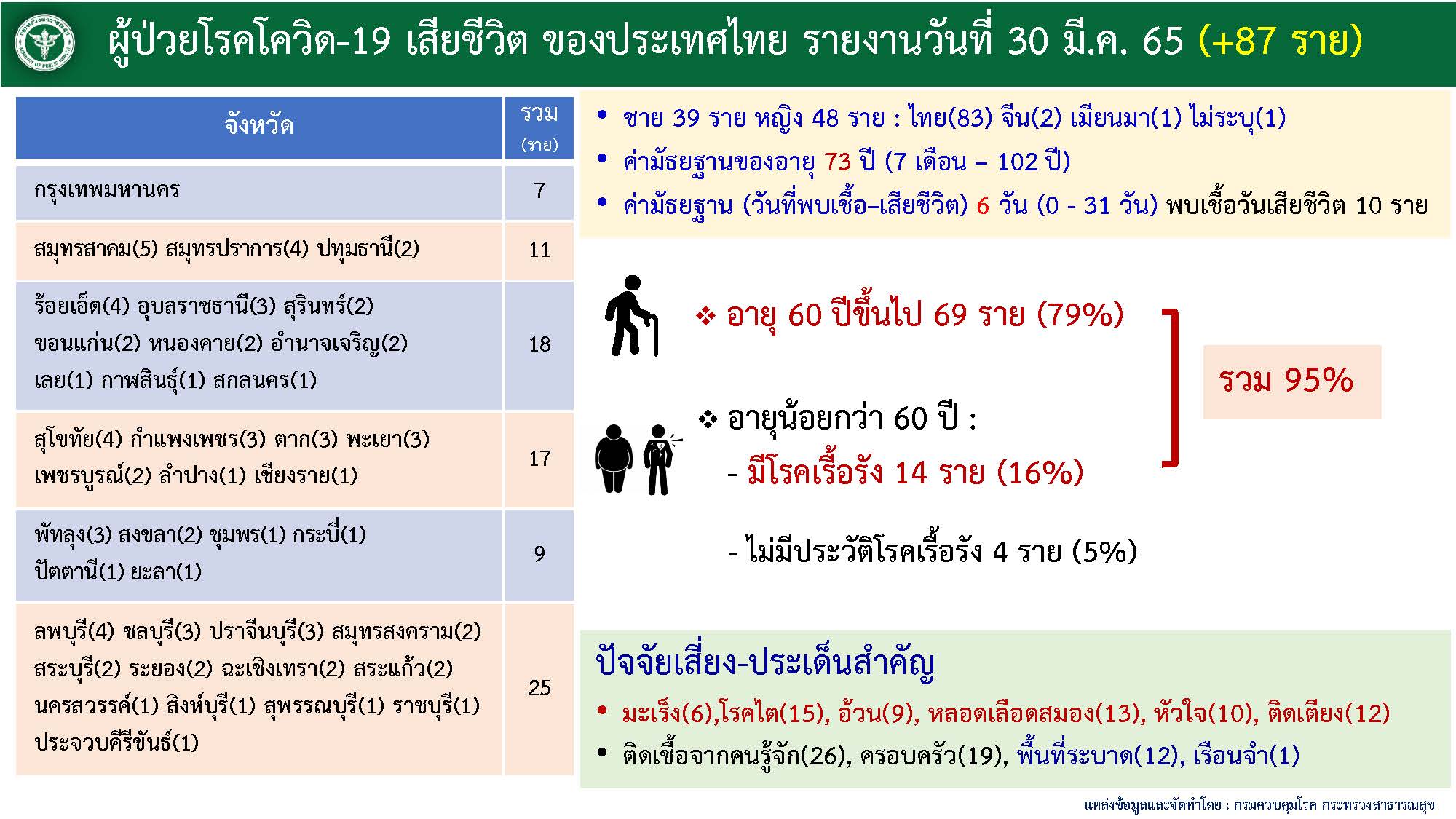 รายละเอียดผู้เสียชีวิตของประเทศไทย วันพุธที่ 30 มีนาคม 2565 จำนวน 87 ราย