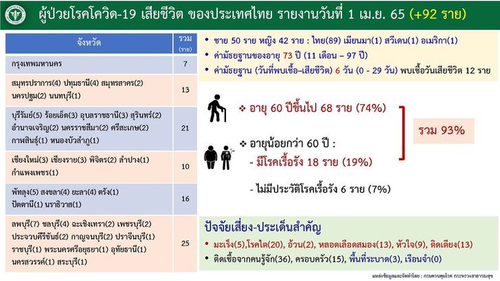รายละเอียดผู้เสียชีวิตของประเทศไทย วันศุกร์ที่ 1 เมษายน 2565 จำนวน 92 ราย