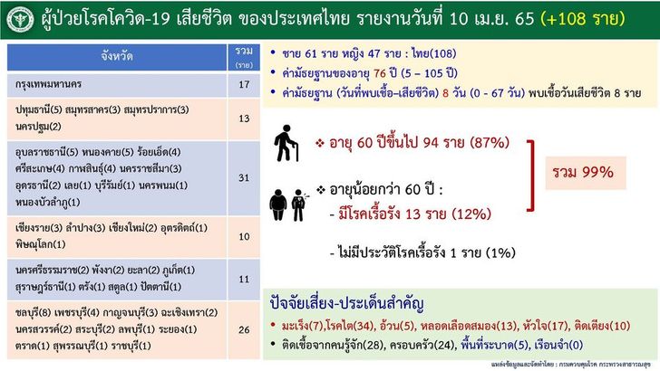 รายละเอียดผู้เสียชีวิตของประเทศไทย วันอาทิตย์ที่ 10 เมษายน 2565 จำนวน 108 ราย