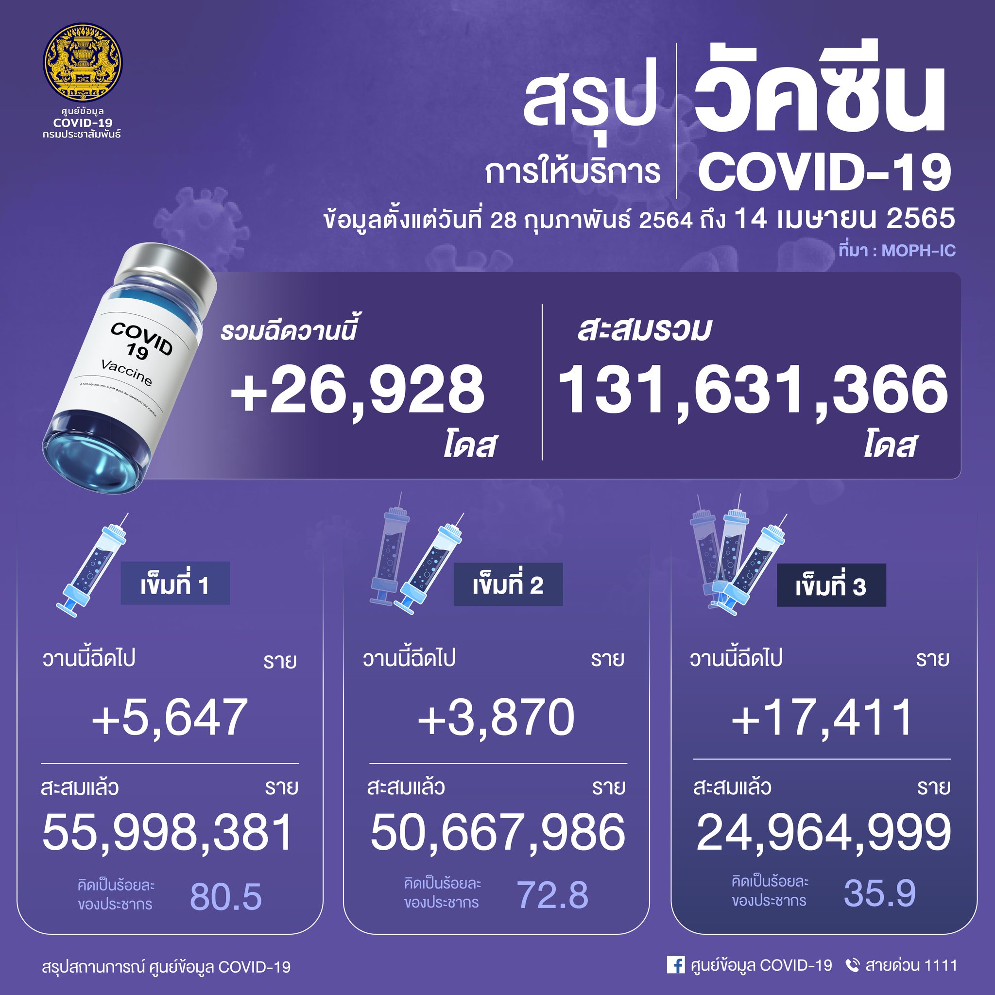 จำนวนการได้รับวัคซีนสะสม (28 ก.พ. 2564 - 14 เม.ย. 2565)รวม 131,631,366 โดส ใน 77 จังหวัด