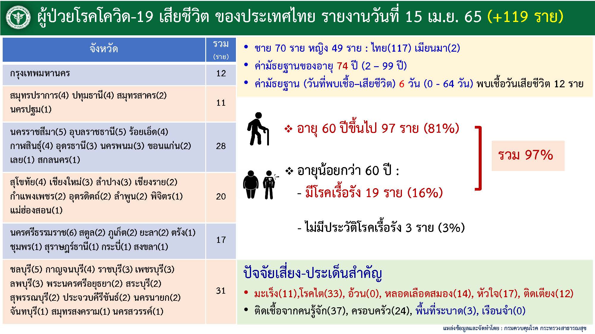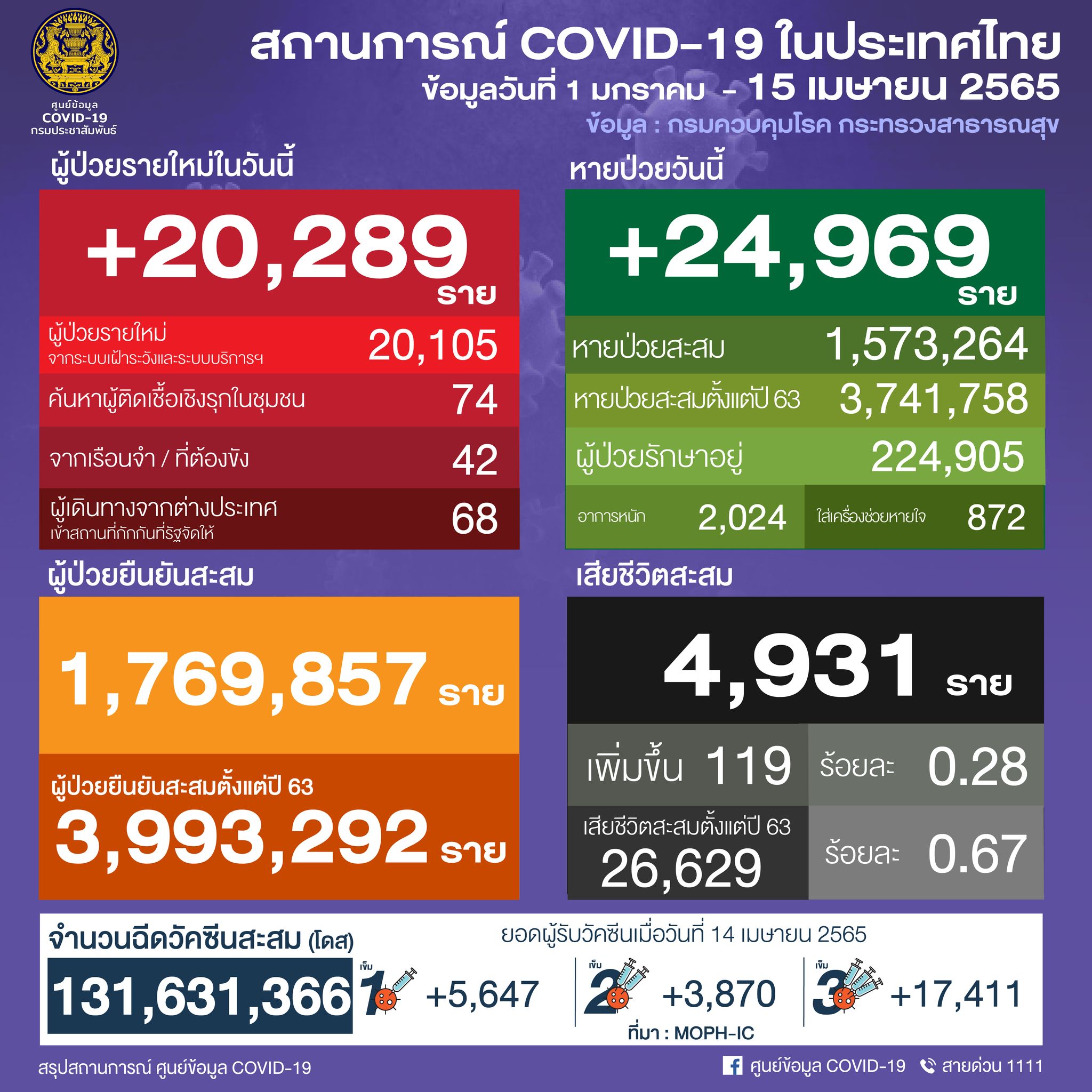 ยอดผู้ติดเชื้อโควิด-19 วันศุกร์ที่ 15 เมษายน 2565 รวม 20,289 ราย จำแนกเป็น