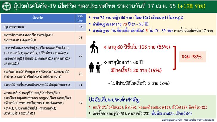 รายละเอียดผู้เสียชีวิตของประเทศไทยวันอาทิตย์ที่ 17 เมษายน 2565 จำนวน 128 ราย