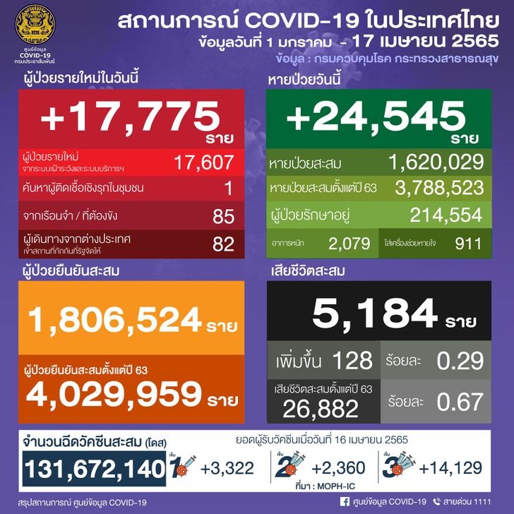 ยอดผู้ติดเชื้อโควิด-19 วันอาทิตย์ที่ 17 เมษายน 2565 รวม 17,775 ราย จำแนกเป็น