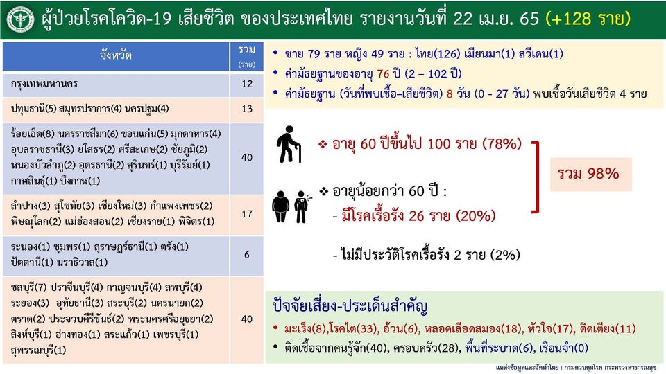 รายละเอียดผู้เสียชีวิตของประเทศไทย วันศุกร์ที่ 22 เมษายน 2565 จำนวน 128 ราย