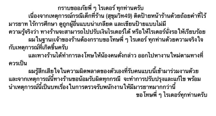 ผมในฐานะเจ้าของร้านต้องกราบขอโทษพี่ๆ ไรเดอร์ ทุกท่านด้วยความจริงใจกับเหตุการณ์ที่เกิดขึ้นครับ และทางร้านได้ทำการลงโทษให้น้องคนดังกล่าว ออกไปหางานใหม่ตามทางที่ควรเป็น