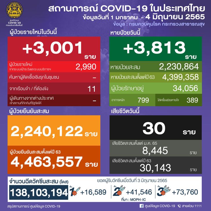 รายงานผู้ป่วยติดเชื้อโควิด-19 วันเสาร์ที่ 4 มิถุนายน 2565 ผู้ป่วยใหม่ จำนวน 3,001 ราย จำแนกเป็น