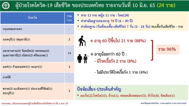 รายละเอียดผู้เสียชีวิตของประเทศไทย วันศุกร์ที่ 10 มิถุนายน 2565 จำนวน 24 ราย
