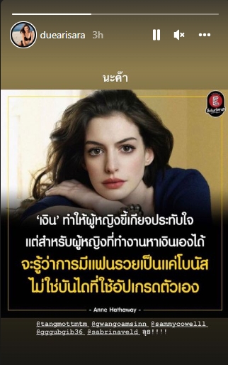 โดยล่าสุด ดิว อริสรา ได้แชร์ข้อความเด็ดลงในอินสตาแกรมสตอรี่ @duearisara ข้อความว่า "เงิน" ทำให้ผู้หญิงขี้เกียจประทับใจ แต่สำหรับผู้หญิงที่ทำงานหาเงินเองได้จะรู้ว่าการมีแฟนรวยเป็นแค่โบนัสไม่ใช่บันไดที่ใช้อัปเกรดตัวเอง