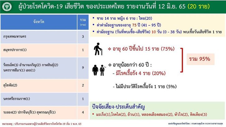 รายละเอียดผู้เสียชีวิตของประเทศไทย วันอาทิตย์ที่ 12 มิถุนายน 2565 จำนวน 20 ราย
