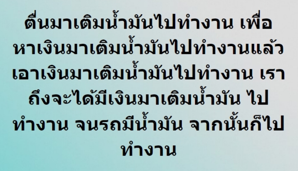 "ตื่นมาเติมน้ำมันไปทำงาน เพื่อหาเงินมาเติมน้ำมันไปทำงาน แล้วเอาเงินมาเติมน้ำมันไปทำงาน เราถึงจะได้มีเงินมาเติมน้ำมัน ไปทำงาน จนรถมีน้ำมันจากนั้นก็ไปทำงาน"