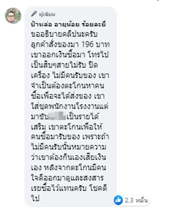 ผู้โพสต์เข้ามาอธิบายเหตุการณ์เพิ่มเติมในคอมเมนต์ว่า "ขออธิบายคลิปนะครับ ลูกค้าสั่งของมา 196 บาท เขาออกเงินซื้อมา โทรไปเป็นสิบๆ สายไม่รับ ปิดเครื่อง ไม่มีคนรับของ เขาจำเป็นต้องตะโกนหาคนซื้อเพื่อจะได้ส่งของ เขาใส่ชุดพนักงานโรงงานแต่มาขับเป็นรายได้เสริม