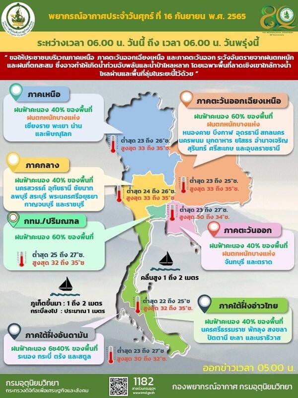 อนึ่ง ในช่วงวันที่ 17-21 ก.ย. 65 ร่องมรสุมจะเลื่อนลงมาพาดผ่านภาคเหนือ ภาคกลาง และภาคตะวันออกเฉียงเหนือ ประกอบกับมรสุมตะวันตกเฉียงใต้ที่พัดปกคลุมทะเลอันดามัน ประเทศไทย และอ่าวไทยจะมีกำลังแรงขึ้น