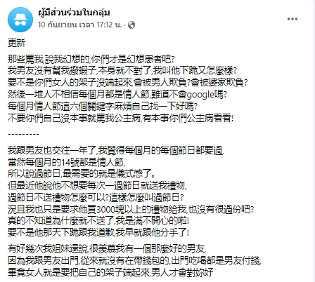 ทั้งนี้ เธอปิดท้ายโพสต์ด้วยการบอกว่ากำลังคิดที่จะเลิกกับชายหนุ่มคนดังกล่าว ในขณะที่ชาวเน็ตต่างวิพากษ์วิจารณ์ว่าตัวเธอนั่นแหละที่ผิด และปฏิบัติต่อคู่รักได้แย่มากๆ