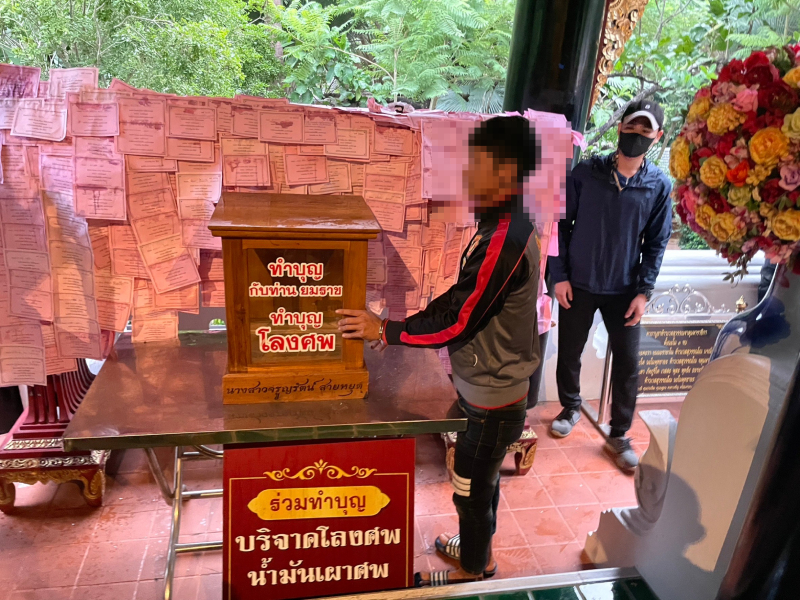 (17 ต.ค.65) พ.ต.อ.คมสันต์ สอาดล้วน ผกก.สภ.แม่ออน จ.เชียงใหม่ พ.ต.ท.วิทยา ใจคำ สว.สส.สภ.แม่ออน พร้อมชุดสืบสวนได้ควบคุมตัว นายเมือง สัญชาติเมียนมา อายุ 24 ปี อดีตทหารกองทัพรัฐฉาน ไปทำแผนประกอบคำรับสารภาพที่บริเวณม่อนกุเวร อุทยานมหาราชท้าวเวสสุวรรณ จันทมงคลสถาน เลขที่ 124 หมู่ที่ 5 ต.ห้วยแก้ว อ.แม่ออน จ.เชียงใหม่ โดยมีคณะศรัทธาชาวบ้านที่ทราบข่าวมารอดูหน้าโจรใจบาปคนนี้จำนวนมาก