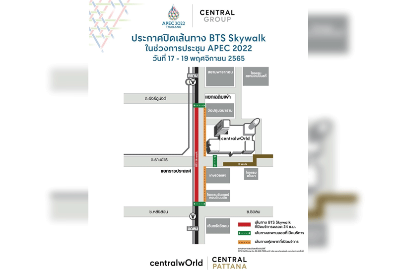แจ้งปิด Sky Walk ตั้งแต่แยกเฉลิมเผ่าจนถึงหน้าอาคารมณียา 17-19 พ.ย.นี้ ประชุม APEC 2022