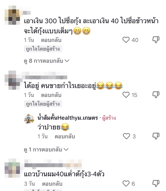ทั้งนี้ หลังคลิปดังกล่าวเผยแพร่ไป ก็มีคนเข้ามาแสดงความคิดเห็นจำนวนมาก ทั้งยังถามว่าคุ้มมั้ย และมีคนมาคอมเมนต์บอกว่า "เอาเงิน 300 ไปซื้อกุ้ง ละเอาเงิน 40 ไปซื้อข้าวหน้าจะได้กุ้งเเบบเต็มๆ" ขณะที่อีกคนบอกว่า "กุ้งไซซ์นี้ซื้อสดโลละ 220 ได้ประมาณ 34 ตัว กำไรคนขายได้อยู่"