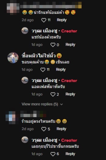 ต่อมาแม่ค้าสาวในคลิปเข้ามาคอมเมนต์ด้วยว่า "ขอบคุณค้าบ เขินเลย"
