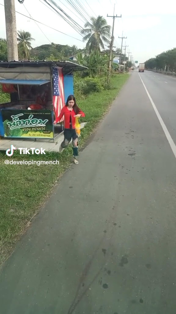ซึ่งเจ้าตัวได้จอดรถเพื่อที่จะแวะซื้อพวงมาลัย ก่อนจะมีแม่ค้าสาวเดินถือพวงมาลัยจากร้านออกมาให้ ที่พอได้เห็นใกล้ๆ ก็ถึงกับสะดุดกับตากับความน่ารักของแม่ค้า ซึ่งทั้งสวย และยิ้มแย้มแจ่มใส ซึ่งเมื่อแม่ค้าสาวเห็นว่าหนุ่มคนขับนั้นถ่ายคลิปอยู่ก็ถึงกับยิ้มและเขินอาย
