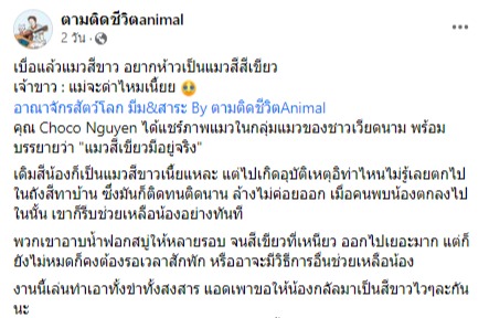 โดย เฟซบุ๊ก ตามติดชีวิตanimal ได้โพสต์ภาพน้องแมวตัวนี้ พร้อมข้อความว่า "เบื่อแล้วแมวสีขาว อยากห้าวเป็นแมวสีสีเขียว