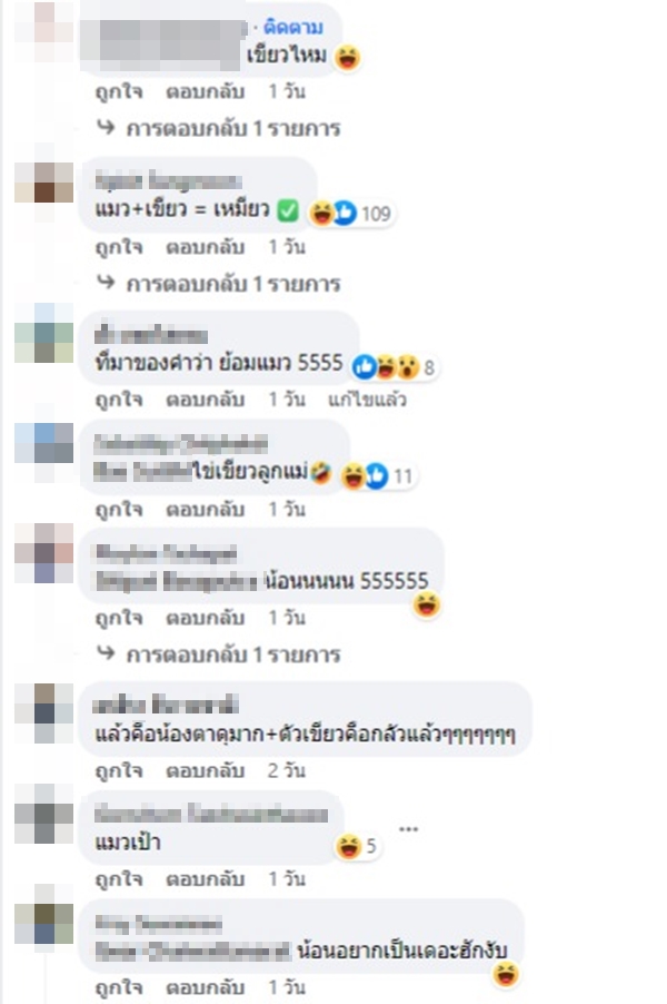 หลังจากโพสต์ถกเผยแพร่ออกไปก็มีบรรดาเจ้าทาสเข้ามาแซวมากมาย หลายคนทั้งขำทั้งสงสารน้องแมว อาทิ ที่มาของคําว่า ย้อมแมว, ไข่เขียวลูกแม่ และ น้อนอยากเป็นเดอะฮักงับ