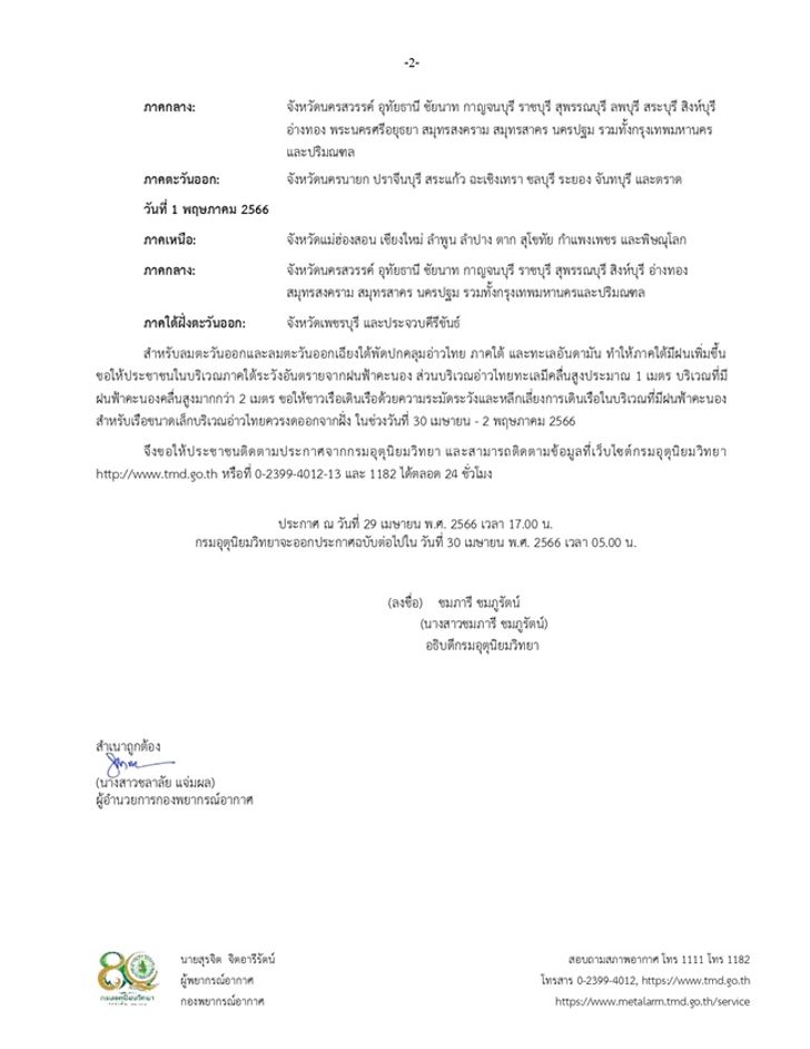 ฝนฟ้าคะนองคลื่นสูงมากกว่า 2 เมตร ขอให้ชาวเรือเดินเรือด้วยความระมัดระวังและหลีกเลี่ยงการเดินเรือในบริเวณที่มีฝนฟ้าคะนอง สำหรับเรือขนาดเล็กบริเวณอ่าวไทยควรงดออกจากฝั่ง ในช่วงวันที่ 30 เมษายน - 2 พฤษภาคม 2566