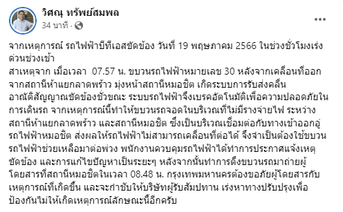 ล่าสุด นายวิศณุ ทรัพย์สมพล รองผู้ว่าราชการกรุงเทพมหานคร ได้โพสต์บนเฟซบุ๊กแฟนเพจส่วนตัว ระบุว่า จากเหตุการณ์ รถไฟฟ้าบีทีเอสขัดข้อง วันที่ 19 พฤษภาคม 2566 ในช่วงชั่วโมงเร่งด่วนช่วงเช้า สาเหตุจาก เมื่อเวลา 07.57 น. ขบวนรถไฟฟ้าหมายเลข 30 หลังจากเคลื่อนที่ออกจากสถานีห้าแยกลาดพร้าว มุ่งหน้าสถานีหมอชิต เกิดระบบการรับส่งคลื่นอาณัติสัญญาณขัดข้องชั่วขณะ ระบบรถไฟฟ้าจึงเบรคอัตโนมัติเพื่อความปลอดภัยในการเดินรถ