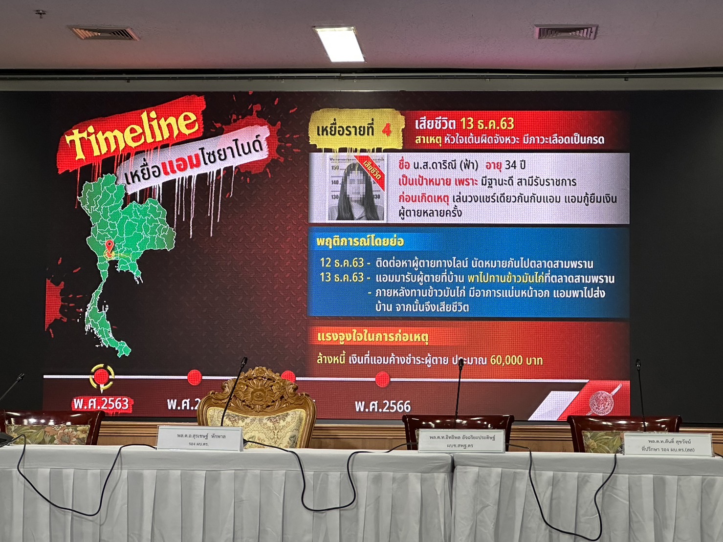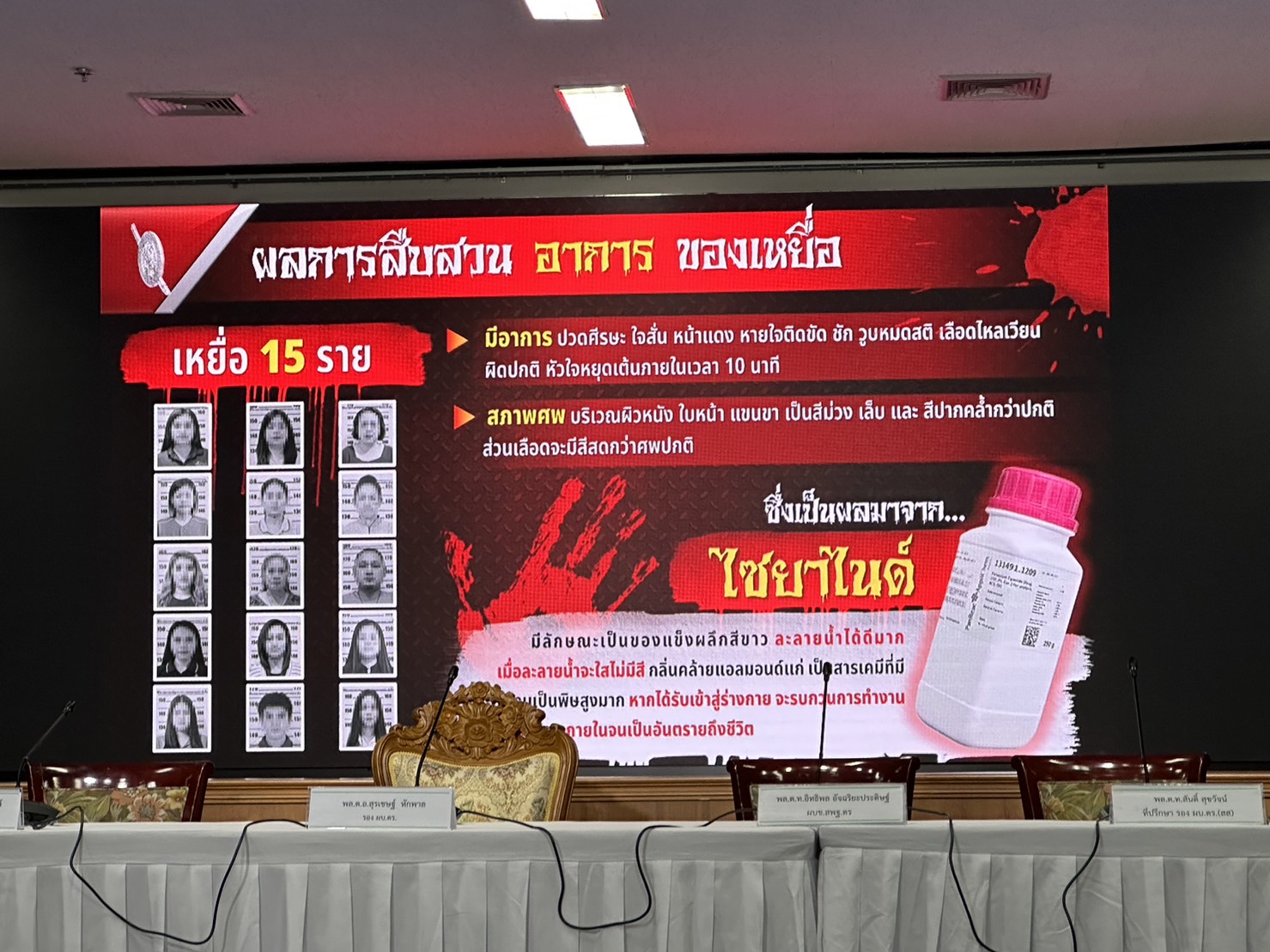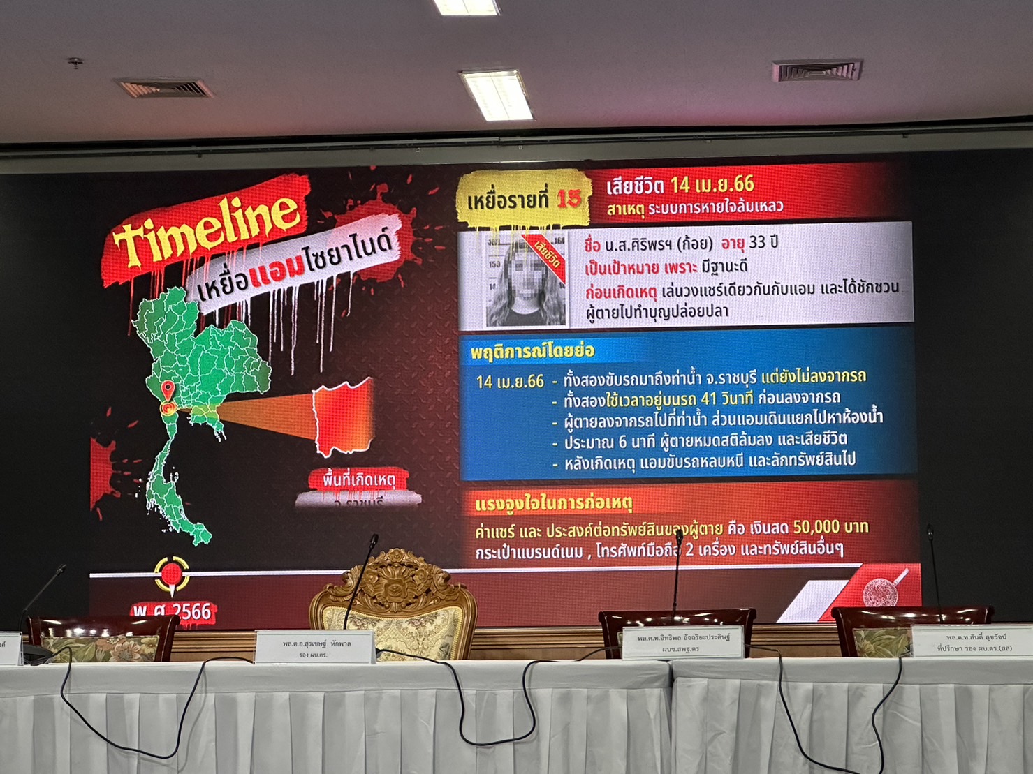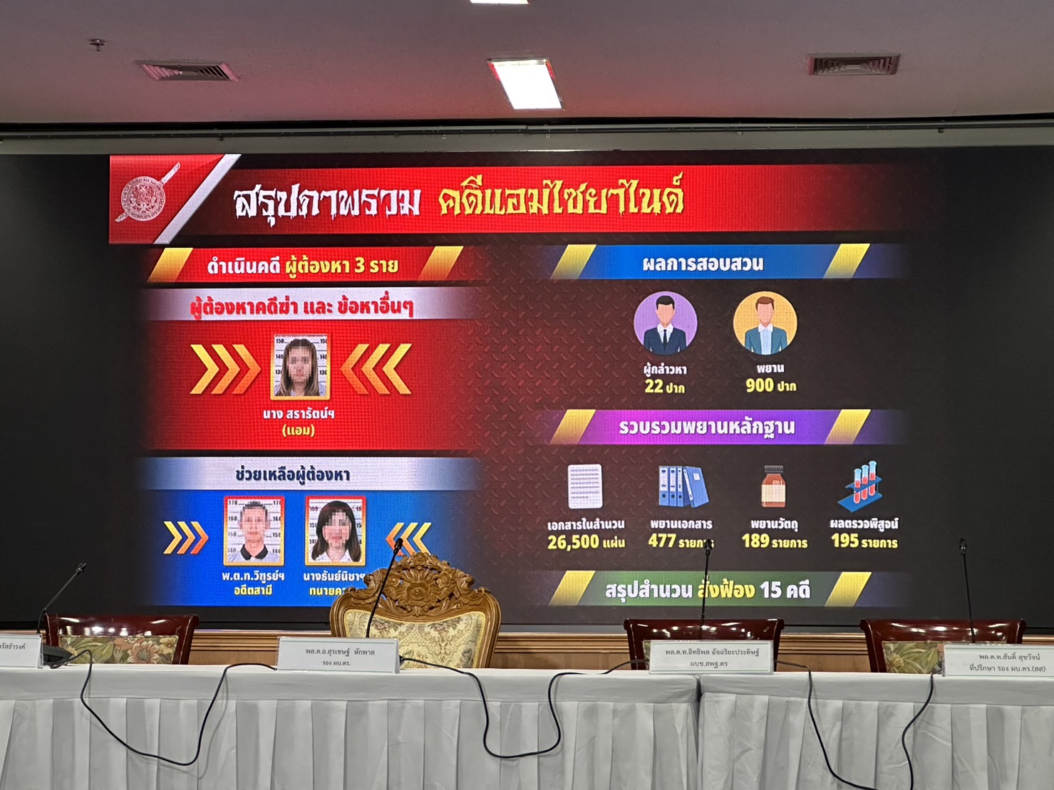 ตำรวจแถลงปิดคดีประวัติศาสตร์ "แอม ไซยาไนด์" พบ 15 คดี ดับ 14 รอดแค่ 1 ราย"บิ๊กโจ๊ก" นำทีมแถลงปิดคดี "แอม ไซยาไนด์" ผู้ต้องหาวางยาฆ่าเจ้าหนี้ 15 คดี ในพื้นที่ 8 จังหวัด ตั้งแต่ 2558-2566 มีผู้เสียชีวิต 14 ราย รอดชีวิต 1 ราย