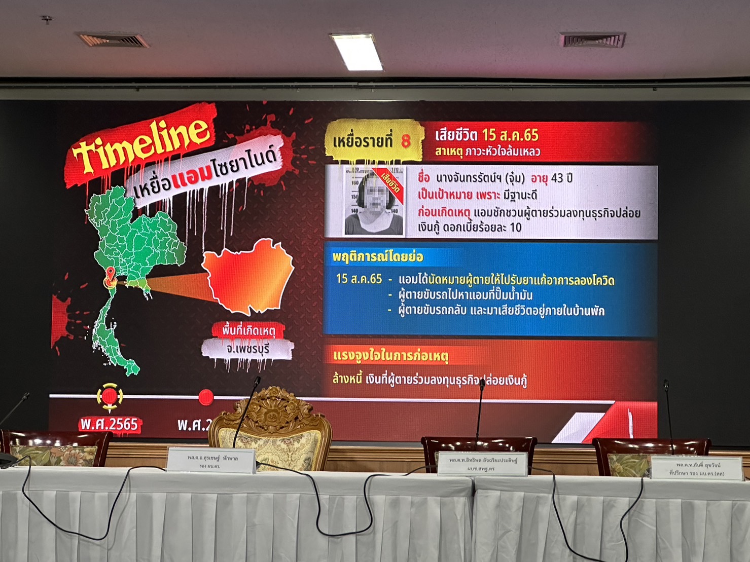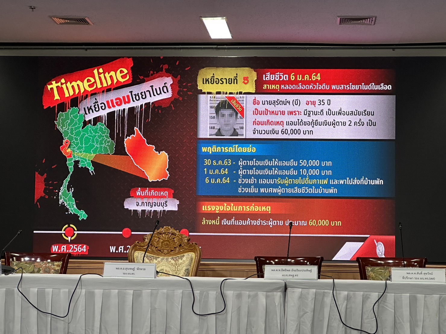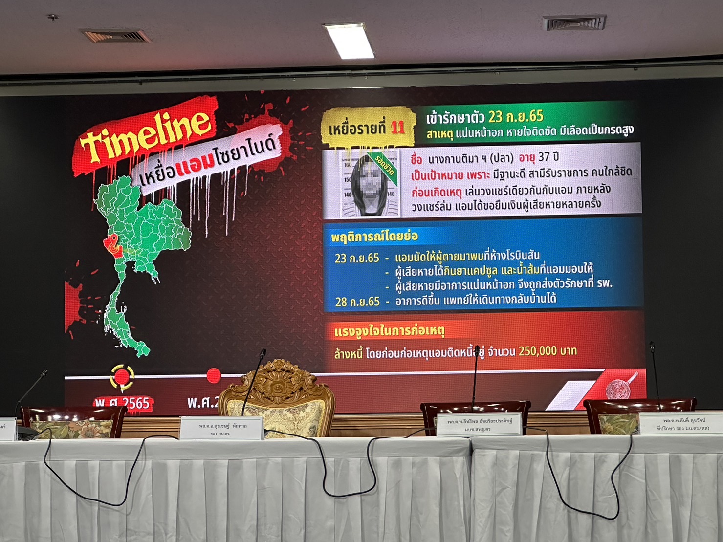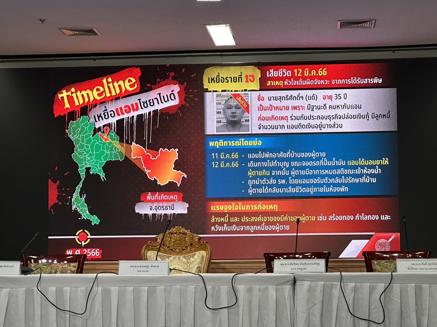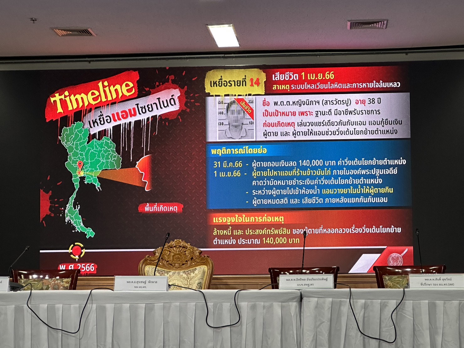ตำรวจแถลงปิดคดีประวัติศาสตร์ "แอม ไซยาไนด์" พบ 15 คดี ดับ 14 รอดแค่ 1 ราย"บิ๊กโจ๊ก" นำทีมแถลงปิดคดี "แอม ไซยาไนด์" ผู้ต้องหาวางยาฆ่าเจ้าหนี้ 15 คดี ในพื้นที่ 8 จังหวัด ตั้งแต่ 2558-2566 มีผู้เสียชีวิต 14 ราย รอดชีวิต 1 ราย