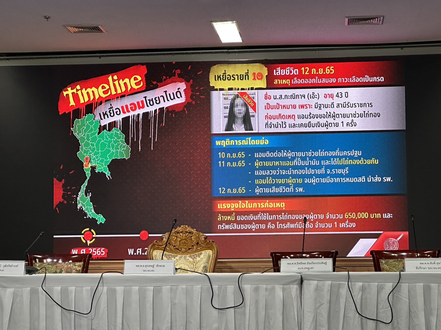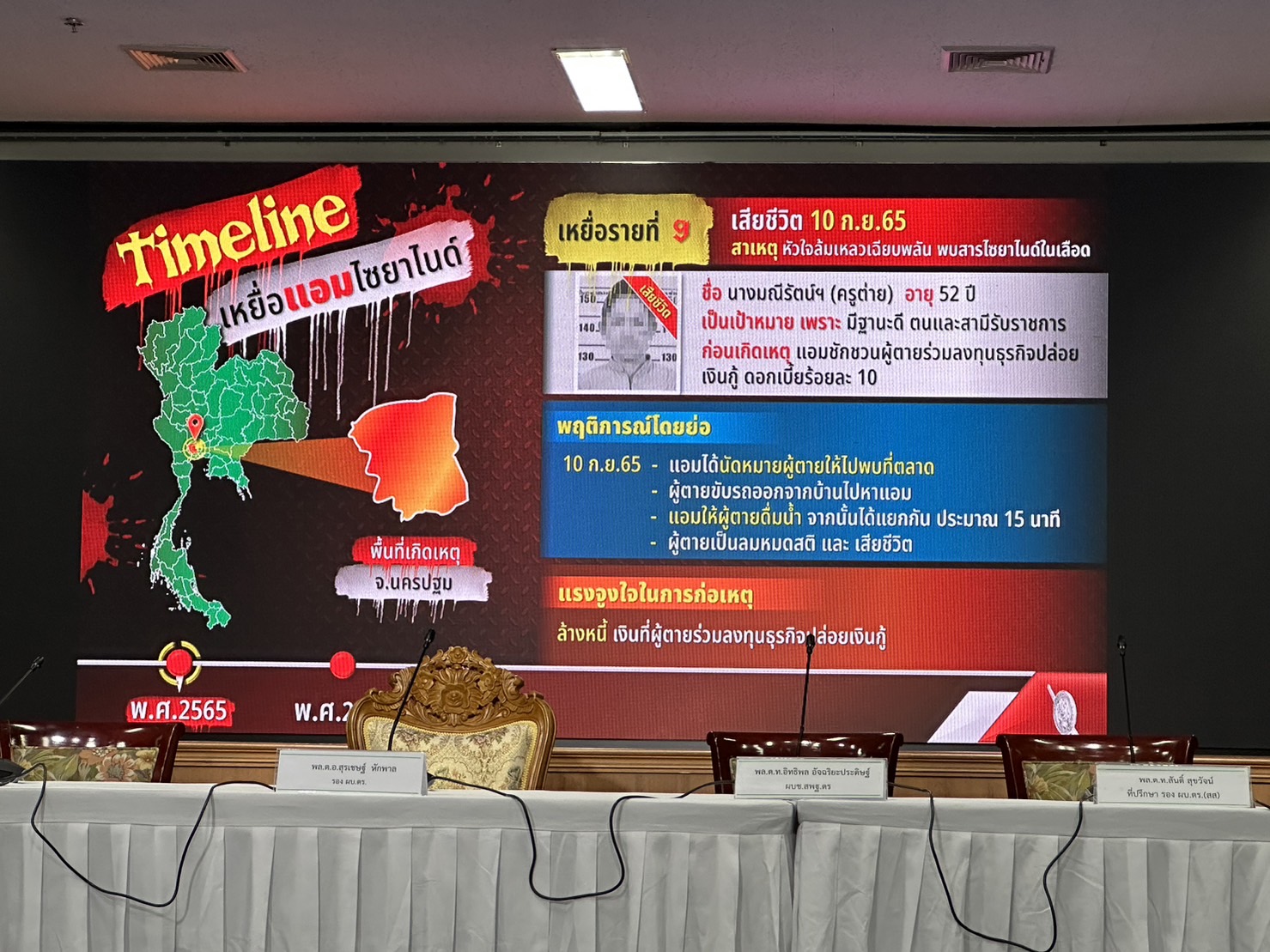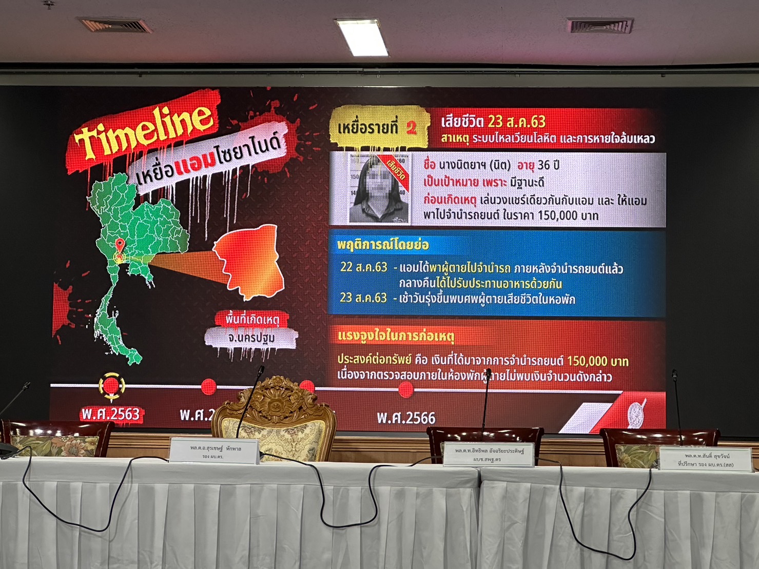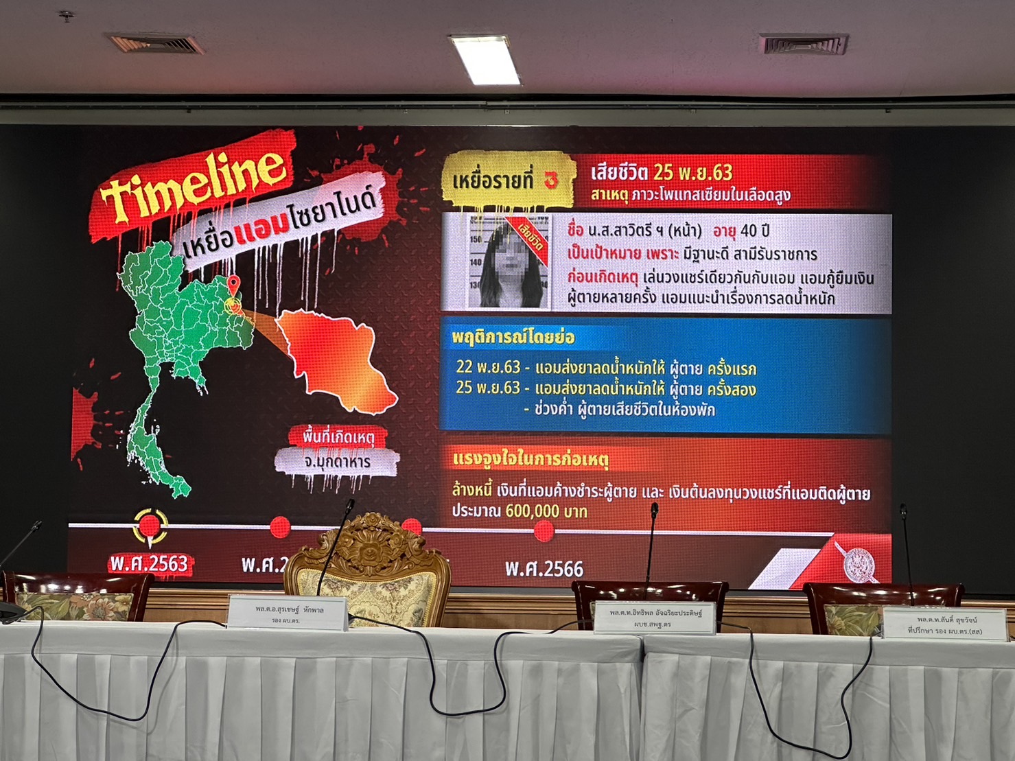 ตำรวจแถลงปิดคดีประวัติศาสตร์ "แอม ไซยาไนด์" พบ 15 คดี ดับ 14 รอดแค่ 1 ราย"บิ๊กโจ๊ก" นำทีมแถลงปิดคดี "แอม ไซยาไนด์" ผู้ต้องหาวางยาฆ่าเจ้าหนี้ 15 คดี ในพื้นที่ 8 จังหวัด ตั้งแต่ 2558-2566 มีผู้เสียชีวิต 14 ราย รอดชีวิต 1 ราย