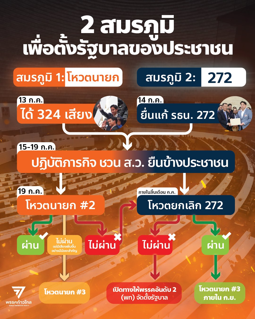 ภารกิจนี้ยังไม่จบ! ก้าวไกลเปิดโรดแมป ฝ่า 2 สมรภูมิ รวบรวมเสียง ส.ว. ปิดสวิตซ์ ม.272 ทำทุกทางเพื่อตั้งรัฐบาลประชาชน แต่หาก 19 ก.ค.นี้พ่ายแพ้ พร้อมเปิดทางเพื่อไทย
