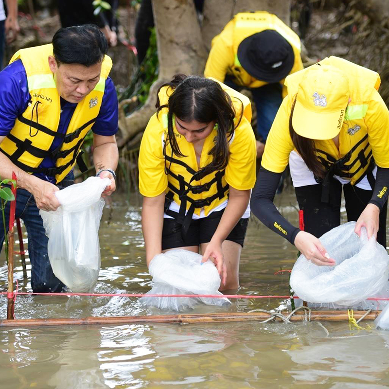 ทางสถาบันฯ ก็ได้เข้าไปมีส่วนร่วมอย่างสม่ำเสมอ ซึ่งในครั้งนี้ได้ร่วมกับสิงห์อาสา นำเครือข่ายนักศึกษาสิงห์อาสาหลายสถาบันร่วมแรงร่วมใจกันกับคนในพื้นที่เติมความสมบูรณ์ให้พื้นที่ป่าชายเลนในบริเวณนี้ ทั้งการปลูกไม้เพิ่มพื้นที่ป่าชายเลนและการปล่อยสัตว์น้ำที่จำเป็นต่อระบบนิเวศ และมีผลต่อการดำรงชีวิตของชาวบ้าน