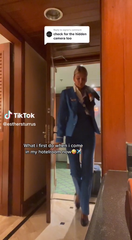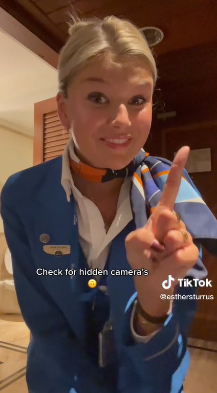 เอสเธอร์ สเตอร์รัส แอร์โฮสเตส ชาวดัตช์วัย 22 ปี ของสายการบิน British TUI Airways และ KLM Royal Dutch Airlines (KLM) มาตั้งแต่ปี 2019 โพสต์คลิปใน TikTok ส่วนตัว ให้ความรู้เรื่องการตรวจสอบสิ่งผิดปกติภายในห้องพักโรงแรม โดยแนะนำจุดต่างๆ ที่อาจจะโดนซ่อนกล้องแอบถ่าย โดยเธอบอกว่า